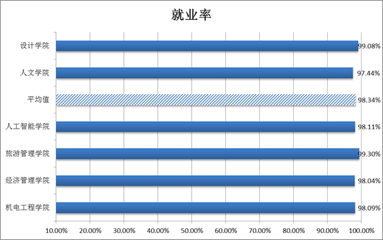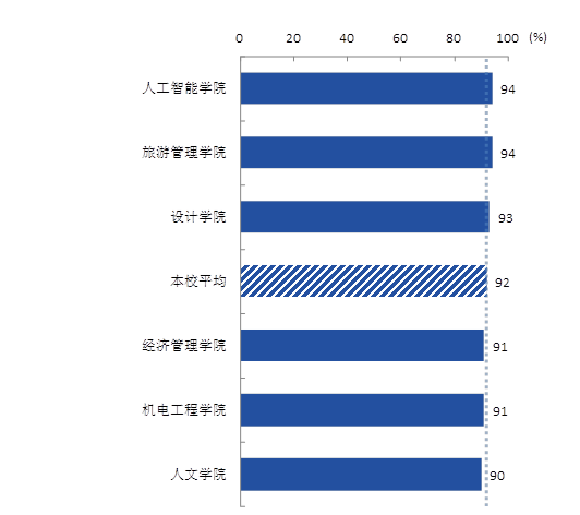 本校2019届毕业生教学满意度较高的学院是人工智能学院(94%)、旅游管理学院(94%)、机电工程学院(91%),教学满意度较低的学院是设计学院(86%)。