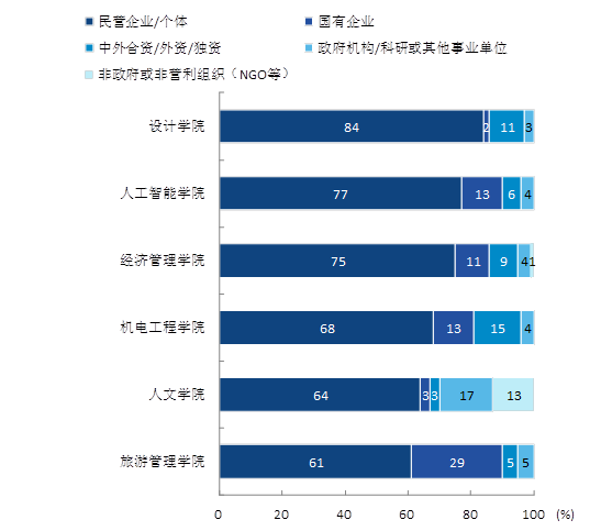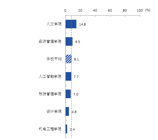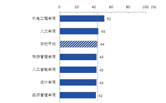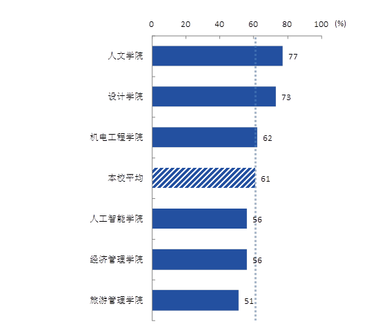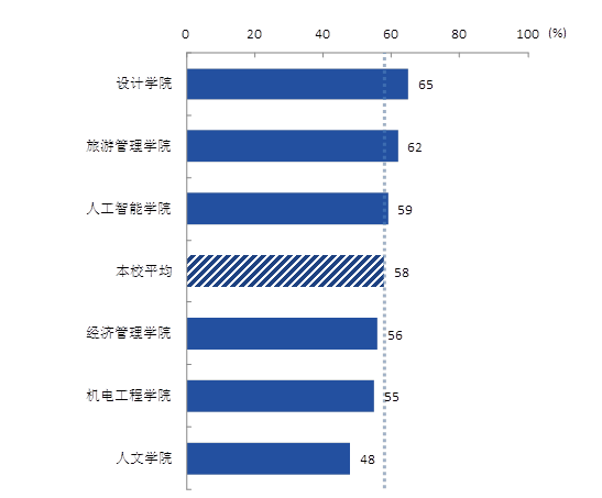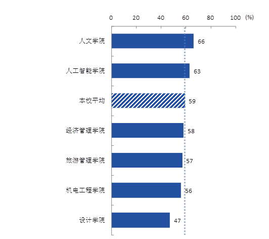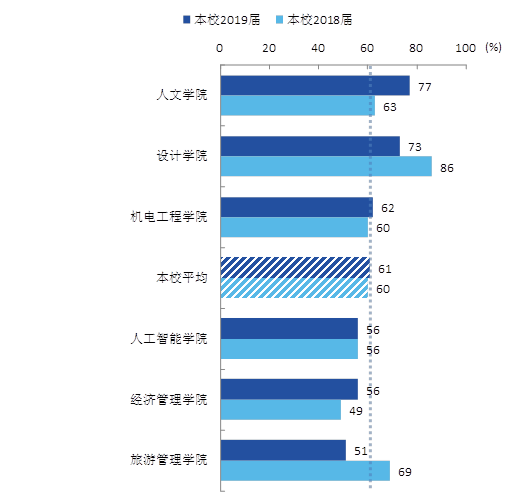本校2019届毕业生愿意推荐母校比例较高的学院是人文学院(66%)、人工智能学院(63%),愿意推荐母校比例较低的学院是设计学院(47%)。