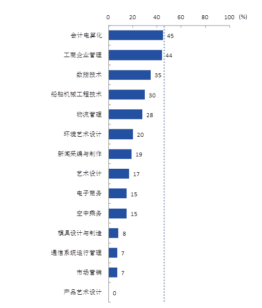 本校2019届毕业生愿意推荐母校比例较高的专业是会计电算化(79%)、学前教育(71%)、电子信息工程技术(70%),愿意推荐母校比例较低的专业是产品艺术设计(27%)、环境艺术设计(35%)、港口与航运管理(41%)。