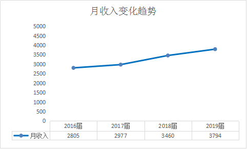 本校2019届毕业生的月收入为3794元,比2018届(3460)高334元,本校毕业生的月收入整体呈上升趋势。