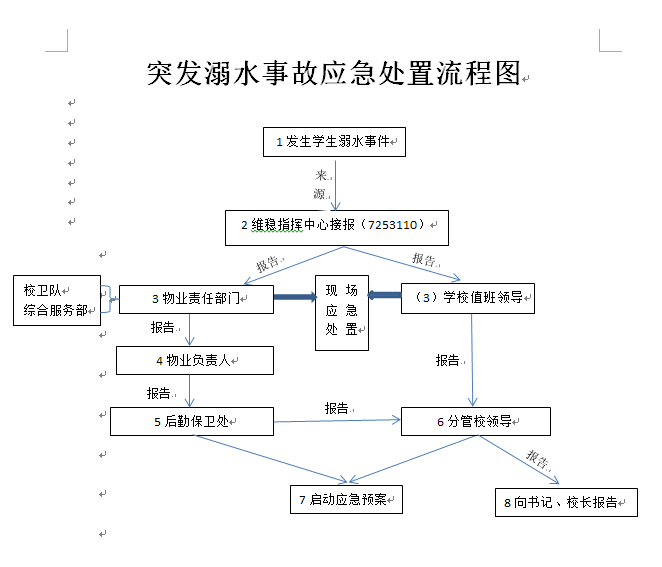 (八)对学生溺水情况及处置结果上报给上级主管部门。(由党政办公室牵头负责,党委学生工作部、后勤保卫处及二级学院配合)