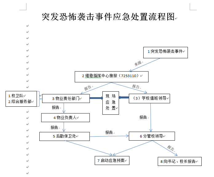 (五)将突发恐怖袭击事件处置结果上报给上级主管部门。(由党政办公室牵头负责,其他单位配合)