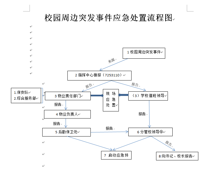 (一)校园周边突发事件时,现场第一人立即向学校安全维稳中心报告(7253110),同时报警。报警中要详细说明违法犯罪行为发生的时间、地点、违法犯罪嫌疑人人数及体貌特征或坐的交通工具颜色、牌号、逃窜方向等情况;根据案情,逐级上报。(由后勤保卫处牵头负责,其他单位配合)