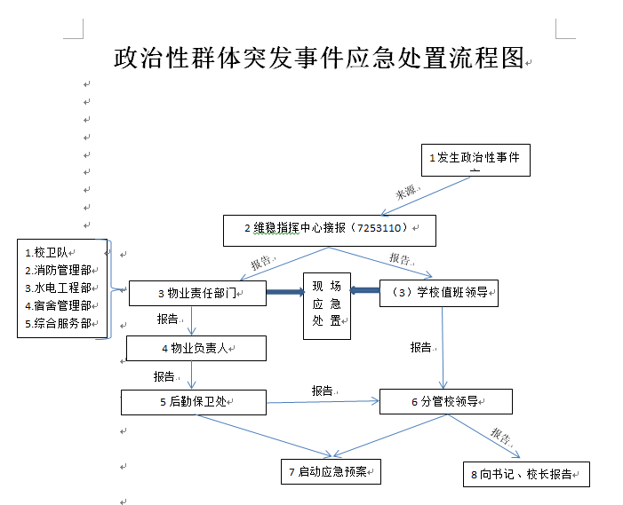 (一)校内发生政治性群体事件时,知情人应及时报告师生所在部门负责人(或辅导员)和校园安全维稳中心(7253110)。(由后勤保卫处牵头负责,其他单位配合)