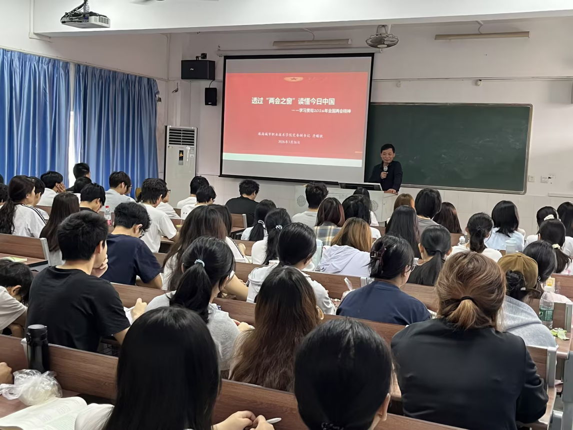 3月26日上午,校党委副书记唐顺铁走进崇文楼5602教室,为2025级云计算技术应用专业1班、工业互联网应用专业1班学生讲授了一堂题为“透过‘两会之窗’读懂今日中国——学习贯彻2026年全国两会精神”的思政课。