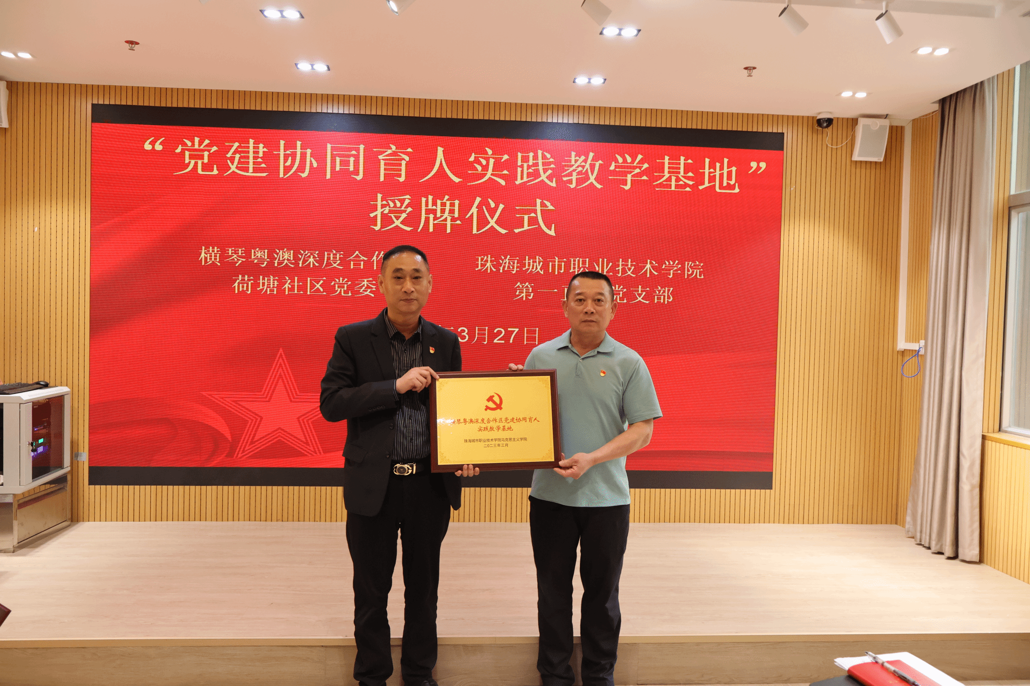活动中,双方党组织书记先后致辞并分别介绍了各自的基本情况、党建工作情况和党建共建合作情况。随后,第一直属党支部书记白立强与荷塘社区党委书记洪锦芳共同签署了党建共建合作协议;白立强同志向荷塘社区党委授予“横琴粤澳深度合作区党建协同育人实践教学基地”“横琴粤澳深度合作区党建研究基地”牌匾。