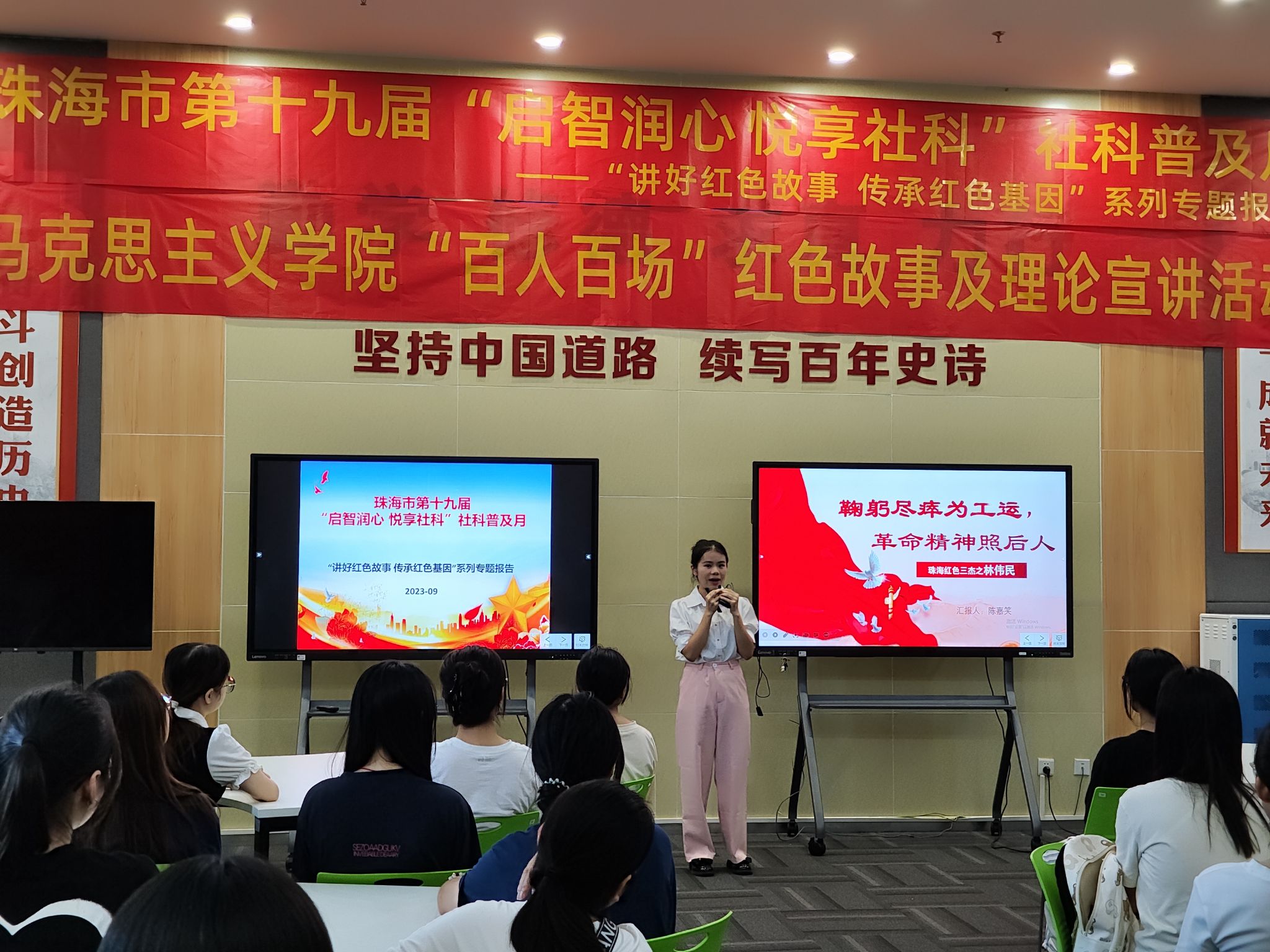 9月27日下午,马克思主义学院新时代大学生理论宣讲队成员陈嘉笑同学在树人馆608室以“杰出工人运动领袖林伟民”为主题进行宣讲。这是马克思主义学院“讲好红色故事 传承红色基因”系列专题报告的第一场,该系列专题报告是珠海市第十九届“启智润心 悦享社科”社科普及月活动的项目之一,将由老师和学生共同完成。马克思主义学院院长白立强教授出席活动并发表讲话,预祝本次社科普及月活动圆满成功。