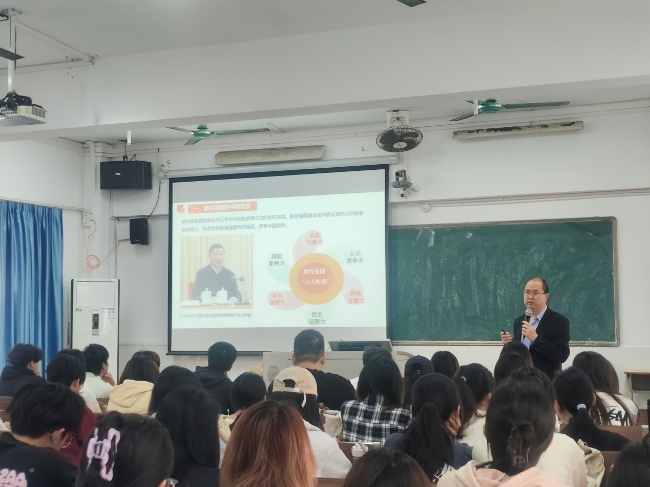 李军利副校长为同学们讲授了一堂以“加快建设教育强国”为主题的思政课。他结合2025年两会精神以及《教育强国建设规划纲要(2024—2035 年)》向同学们讲授了中国特色社会主义教育强国的鲜明特质以及建设教育强国的原因,并联系学生专业,引导他们思考如何为建设教育强国贡献力量。他鼓励同学们努力学习专业技能,勇敢承担时代使命,为中国式现代化贡献青春智慧和力量。