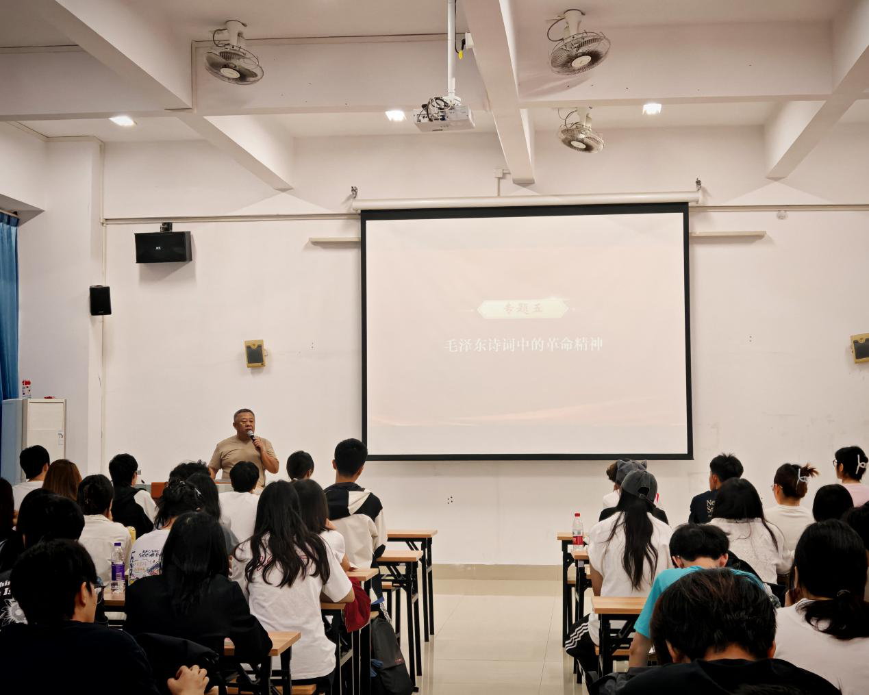 陈斗雪校长为2024级旅游管理专业和新能源汽车技术专业学生讲授了一堂以“毛泽东诗词中的革命精神”为主题的思政课。课堂上,陈斗雪校长以毛泽东诗词为主线,围绕“青少时期”“土地革命”“长征岁月”“解放战争”“建设年代”五个阶段,带领同学们回顾了毛泽东同志在不同历史时期的革命实践与思想情感,深刻诠释了毛泽东诗词中所蕴含的文化魅力、革命精神与时代价值。他指出,毛泽东诗词不仅是中华优秀传统文化创造性转化的典范,更是中国共产党百年奋斗历程的生动写照,是青年学生汲取精神力量、树立文化自信、坚定理想信念的重要载体。