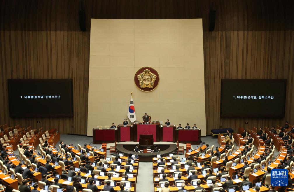 12月14日,在韩国首尔,韩国国会议员参加弹劾动议案投票。新华社记者 姚琪琳 摄
