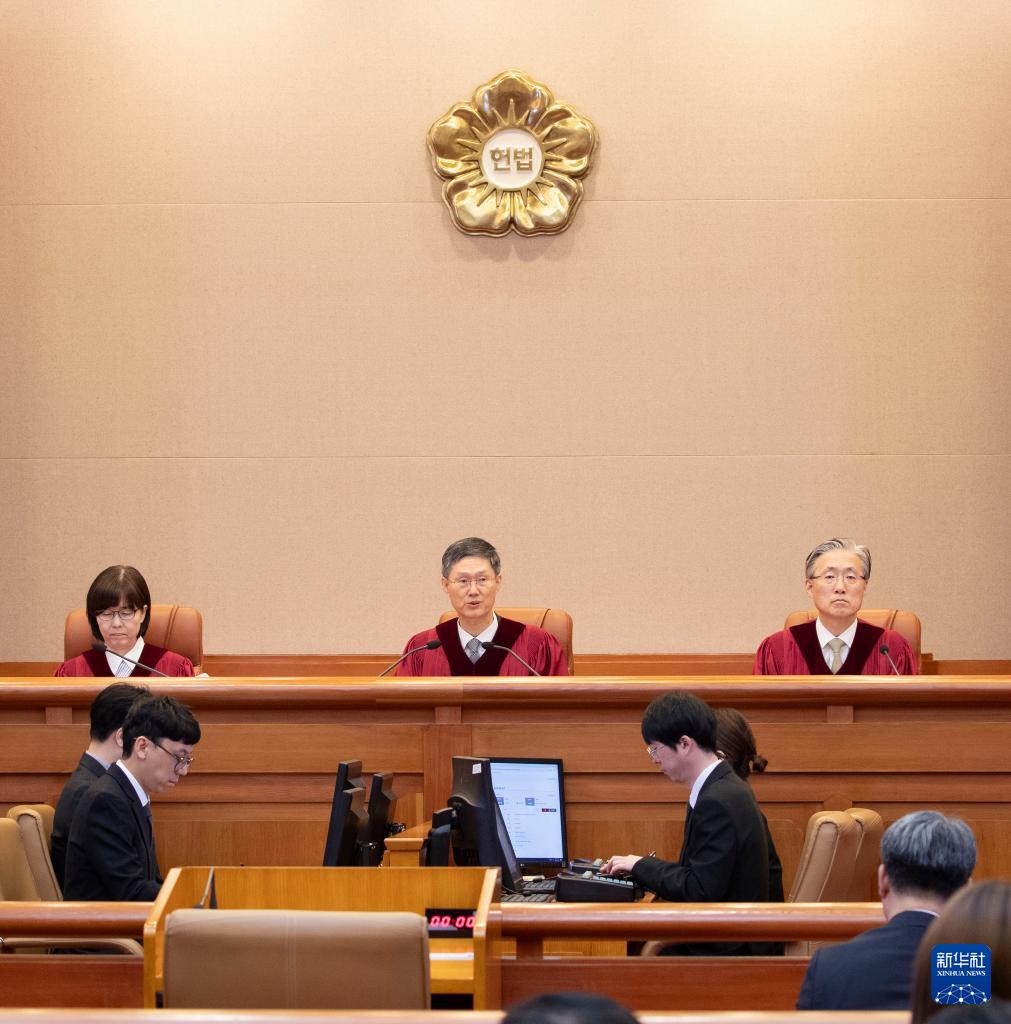 4月4日,在韩国首都首尔,韩国宪法法院代理院长文炯培(中)宣读尹锡悦弹劾案裁决书。
