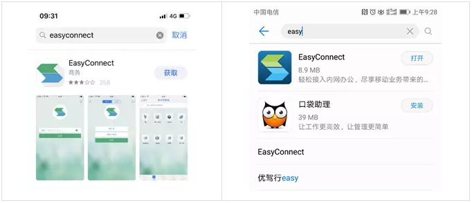 1、在应用商城(APP store)下载并安装easyconnect客户端: