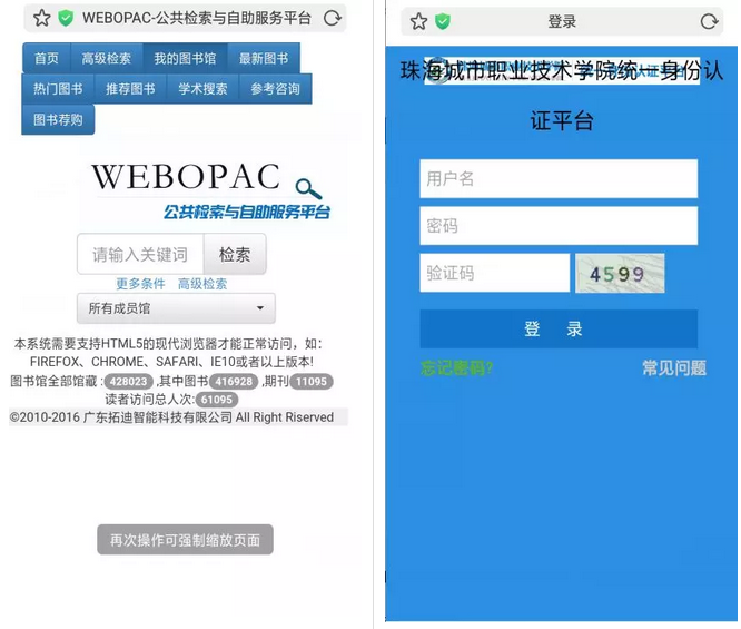 5、在图书检索系统,可以直接检索图书资源;点击“我的图书馆”登录后可查询所借的图书历史信息,以及进行续借: