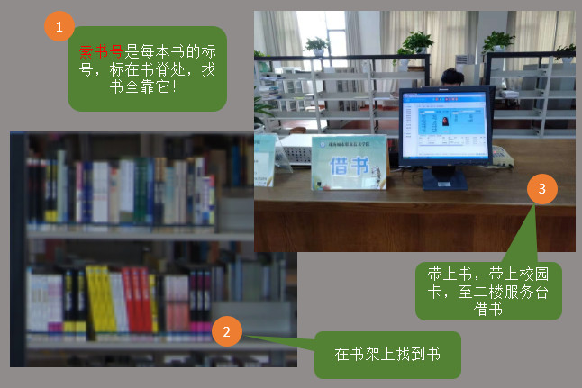 借取图书须用校园卡(即饭卡),在书架拿取图书后,至图书馆二楼服务台,将校园卡放在所要借取的书上,一起递交给老师。老师登记好你的借取信息,会将校园卡和书籍一起交还给你。此时,借取成功。借阅图书必须本人持卡借取,不得代借、转借。