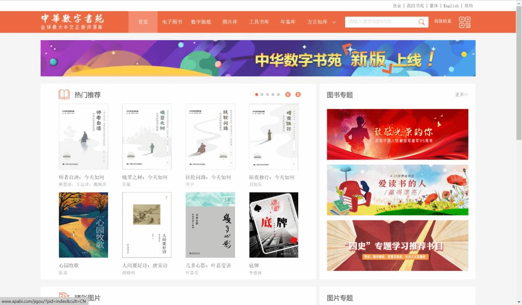 中华数字书苑是方正阿帕比推出的专业的优质中文数字内容整合服务平台。中华数字书苑与近千家出版社及报社合作,以数据库方式,收录了海量丰富优质正版数字资源,约150万册电子图书可供全文检索、在线试读,70万册可供全文下载;约300种全国各级各类报纸;10万种艺术类、设计类、建筑类等珍贵图片,约1800多种2500多册工具书。在数字化时代,中华数字书苑收录了中华人民共和国成立以来大部分的图书全文资源、全国各级各类报纸及年鉴、工具书、图片等特色资源。通过中华数字书苑,各类图书馆、企业、政府等机构客户及其所属读者实现了在线阅读、全文检索、离线借阅、移动阅读各类数字内容,满足了数字时代的基本需求。