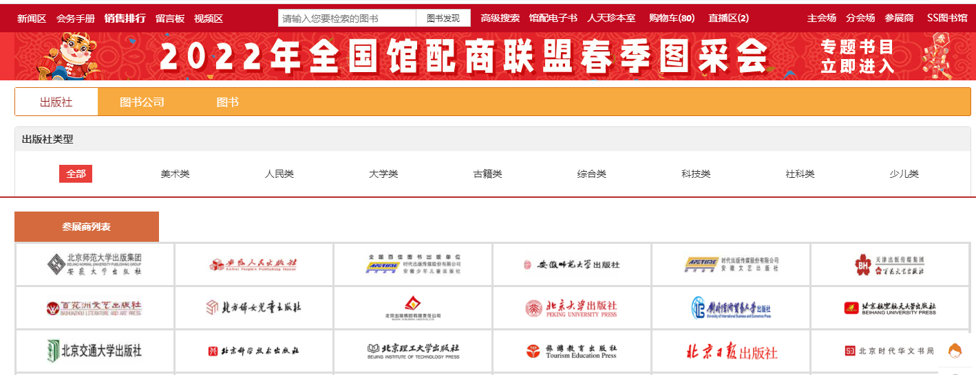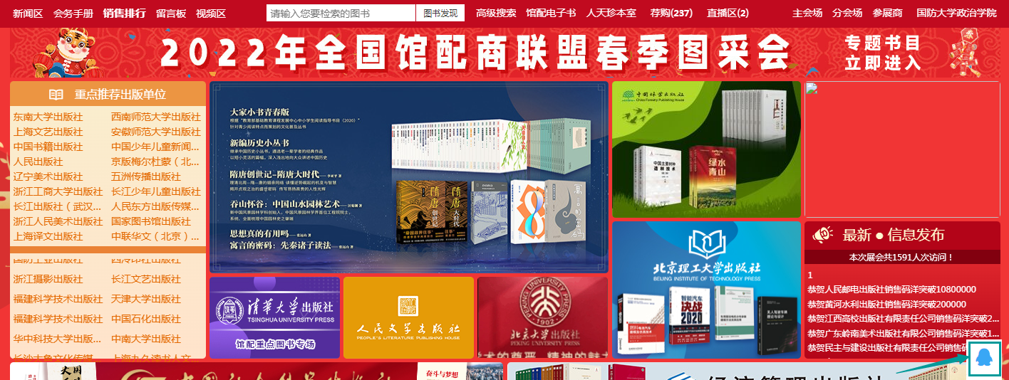 其右上角展示图采会开幕式领导讲话及平台消息发布。其他板块主要展示重点出版社书目,直接点击出版社名称即可进入选书界面。