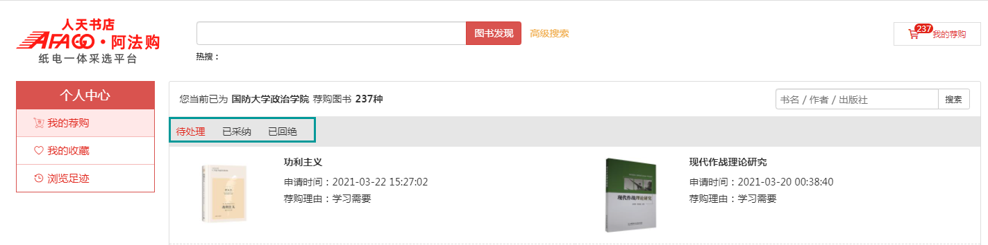 【个人中心】→【我的荐购】中可查看到所有的荐购书目,及图书馆的采纳情况。