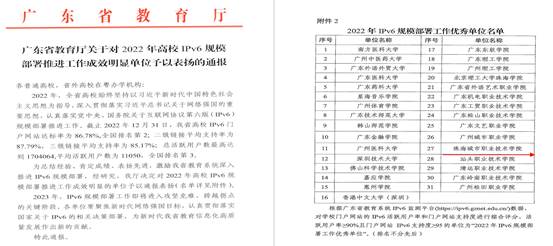 (信息技术中心 报道)近日,广东省教育厅对2022年高校IPv6规模部署推进工作成效明显单位进行通报表扬,根据广东省教育系统IPv6监测平台指标数据,我校被评为2022年IPv6规模部署工作优秀单位。