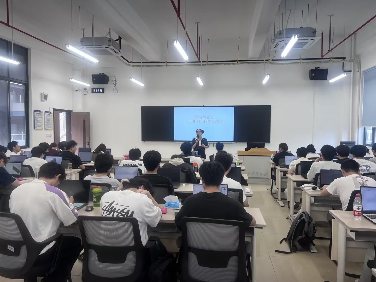 学风建设“严要求”。同日,学院党总支副书记党日丽主持召开学风专项会议,传达学校学风建设相关要求,强调学生宿舍严禁违规使用电器,部署学业预警帮扶工作,切实提升学院学风建设水平。