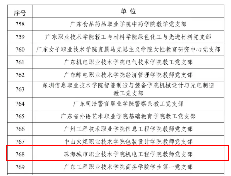 近日,教育部公布第四批全国党建工作示范高校、标杆院系、样板支部培育创建单位名单。珠海城市职业技术学院机电工程学院教师党支部获批全国党建工作样板支部培育创建单位。