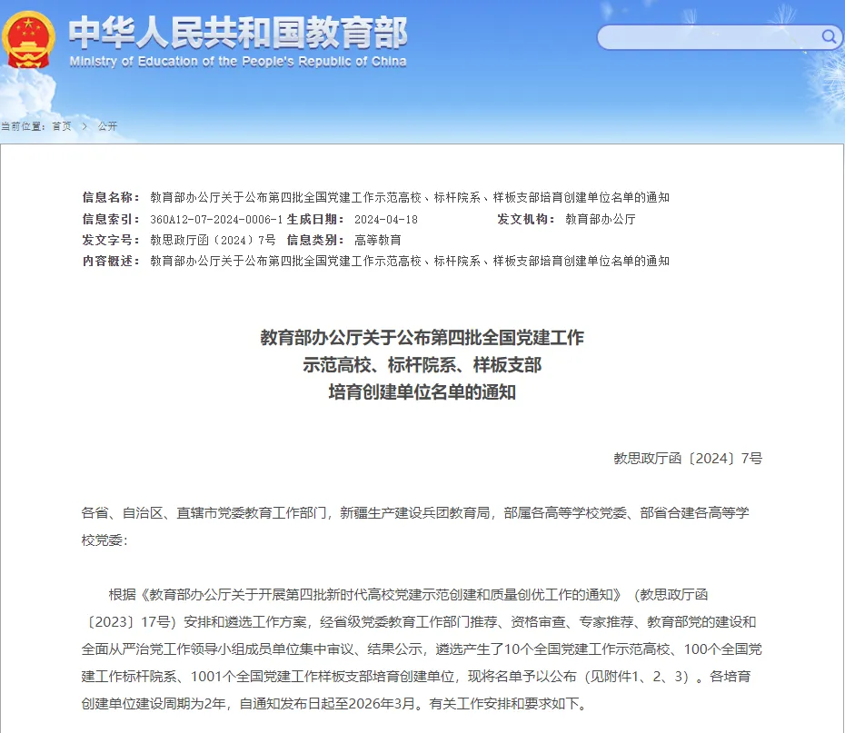 图1 教育部办公厅关于公布第四批全国党建工作示范高校、标杆院系、样板支部培育创建单位名单的通知