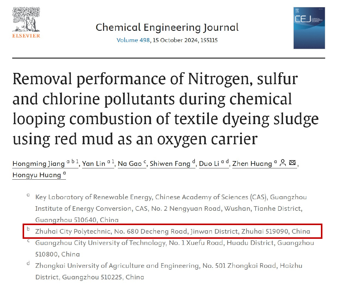 Jiang, H. M.; Lin Y.; Gao N.; Fang S, et al. Removal performance of Nitrogen, sulfur and chlorine pollutants during chemical looping combustion of textile dyeing sludge using red mud as an oxygen carrier, Chemical Engineering Journal, 2024, 498, 155115(影响因子:13.5)