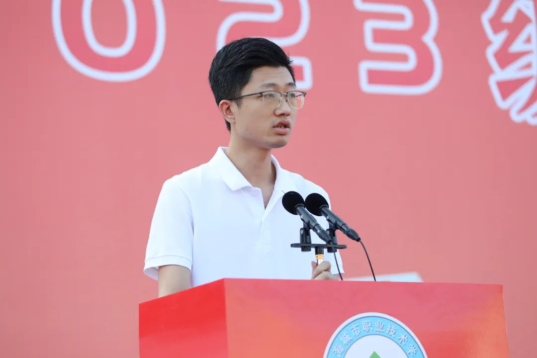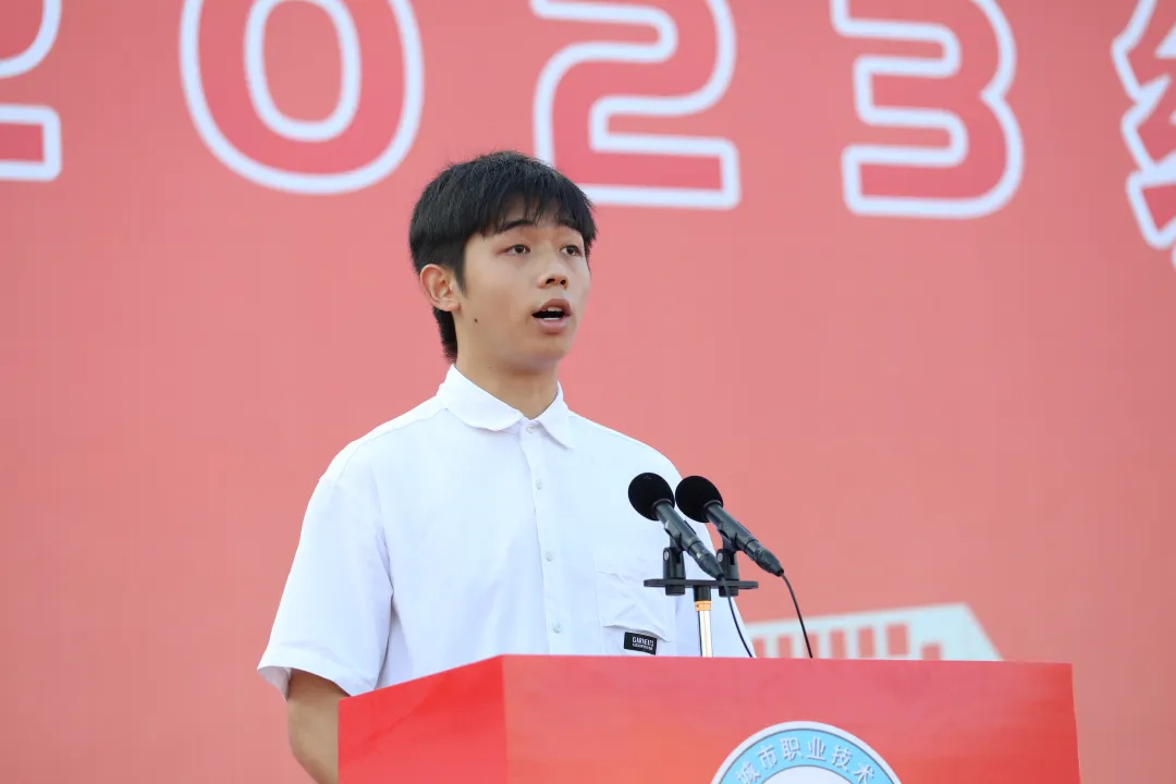 机电工程学院2023级新能源汽车专业颜浩源同学做新生代表发言,他表示城职是梦想的起点,号召全体新生迈向未来,要牢记使命,只争朝夕、不负时光,肩负起时代赋予的重任,撸起袖子加油干。