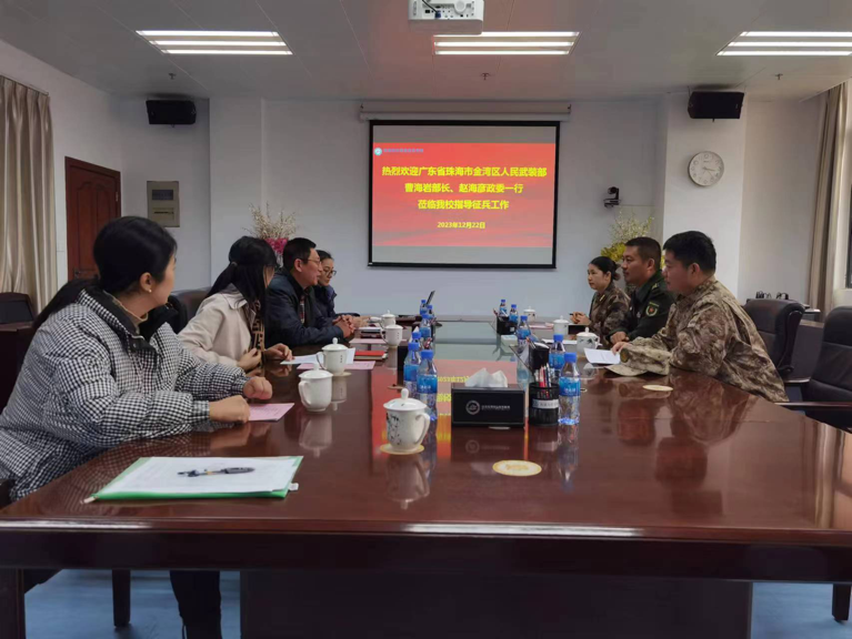 12月22日下午,珠海市金湾区人民武装部部长曹海岩上校,珠海市金湾区人民武装部政委赵海彦上校,珠海市金湾区人民政府征兵办公室钟秀容参谋一行3人来我校调研征兵工作。学校党委委员、副校长刘向阳,党委学生工作部(处)部长周雁嫦等负责征兵工作的人员参加本次会议。
