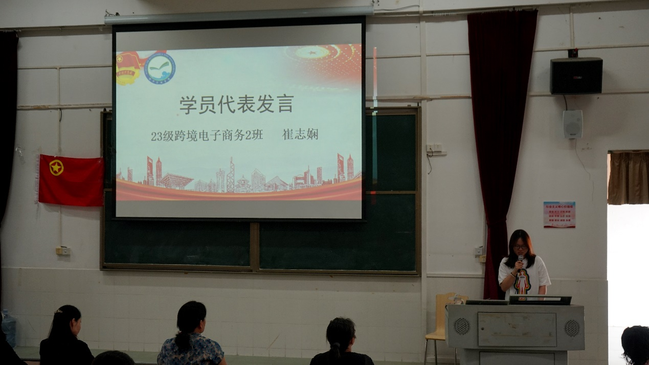 23级跨境电子商务2班崔志娴在青马课程启动仪式上代表发言,强调青年人要以梦想汇聚力量,以马克思主义为指导,为民族复兴贡献智慧。她呼吁大家携手共进,以信念为指引,为中华复兴贡献青春力量。
