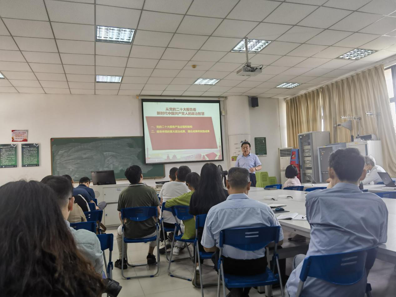 郭江平同志以《从党的二十大报告看新时代中国共产党人的政治智慧》为题讲授主题教育专题党课。他从党的二十大报告中集中体现的新时代以来我们党取得的重大政治成果、理论成果、实践成果三个方面,带领大家更好的把握党的二十大报告的精神实质。