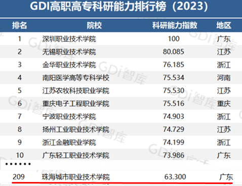 (质量管理和科研处报道)4月25日,广州日报数据和数字化研究院(GDI智库)发布“GDI高职高专科研能力排行榜(2023)”,对全国1489所高职高专院校(不含香港特别行政区、澳门特别行政区和台湾地区院校)的科研能力进行评价,我校排名全国209位。